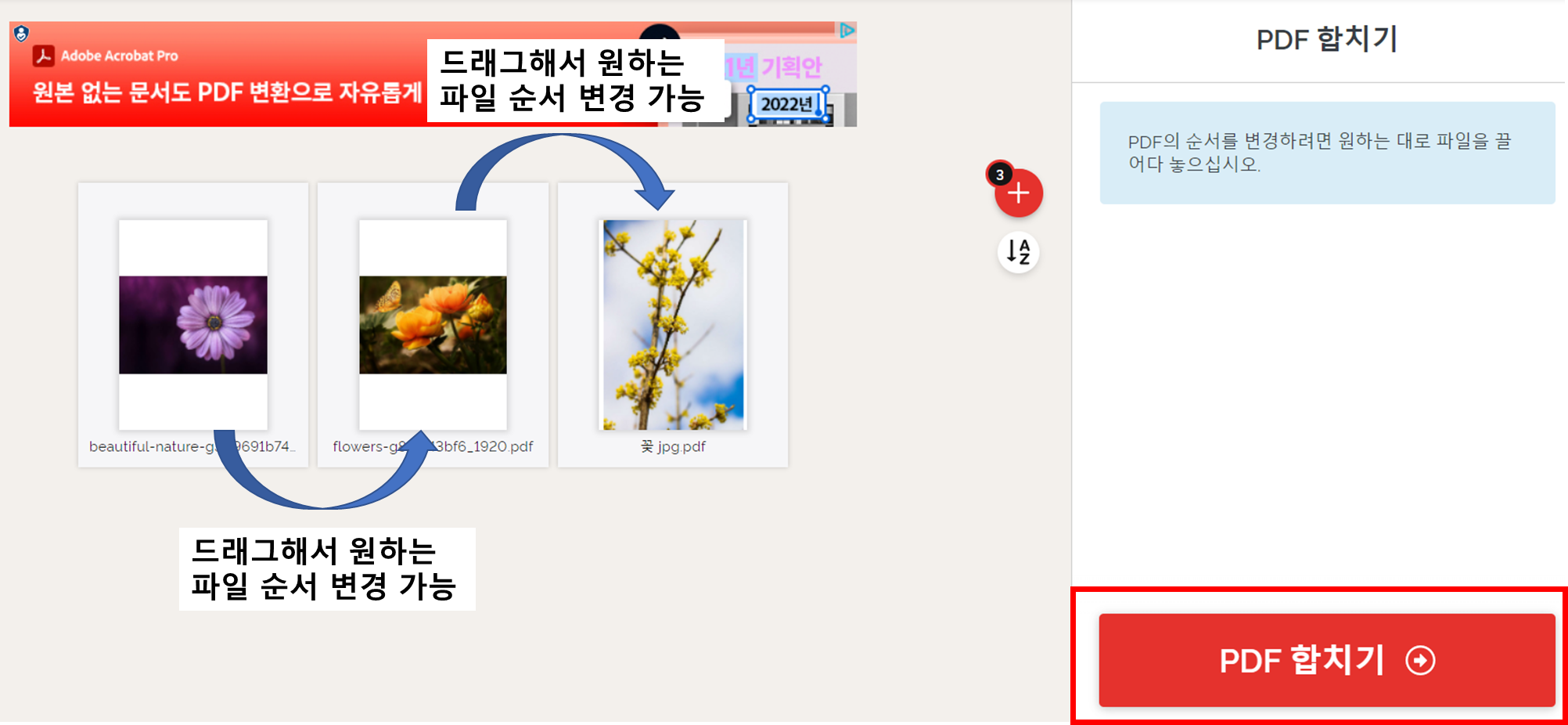파일이 선택된 화면입니다. 파일을 드래그해서 PDF 순서를 변경하실 수 있습니다. 원하시는 순서대로 나열했으면 오른쪽 아래에 PDF 합치기를 눌러주세요.