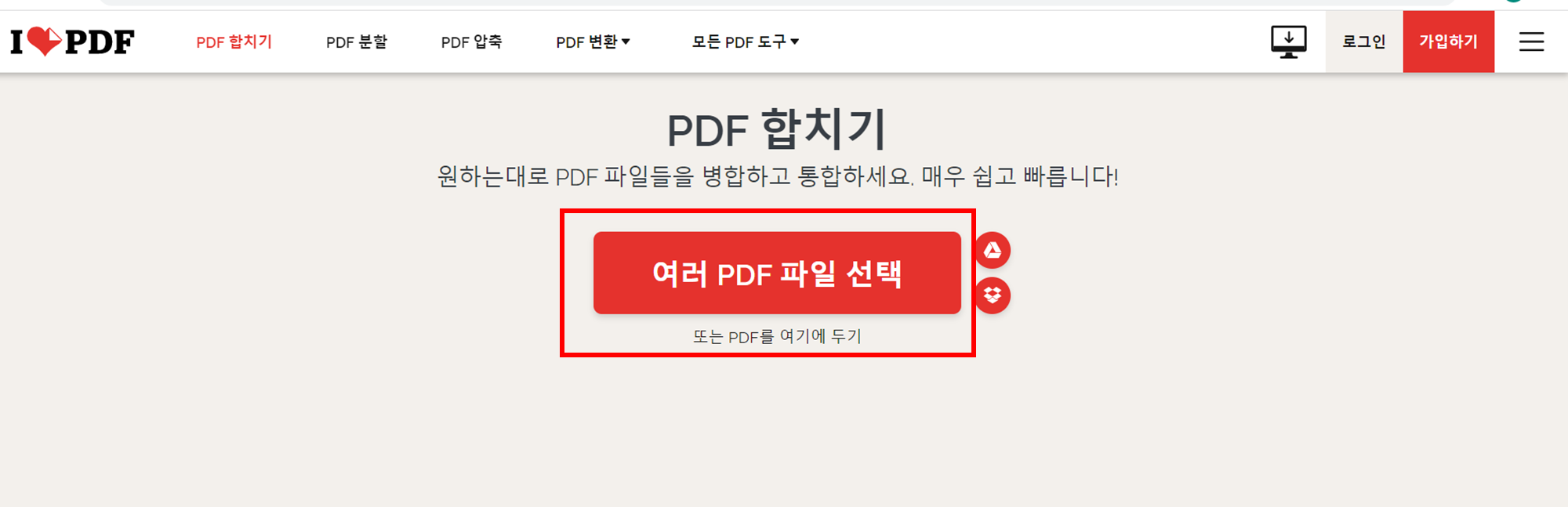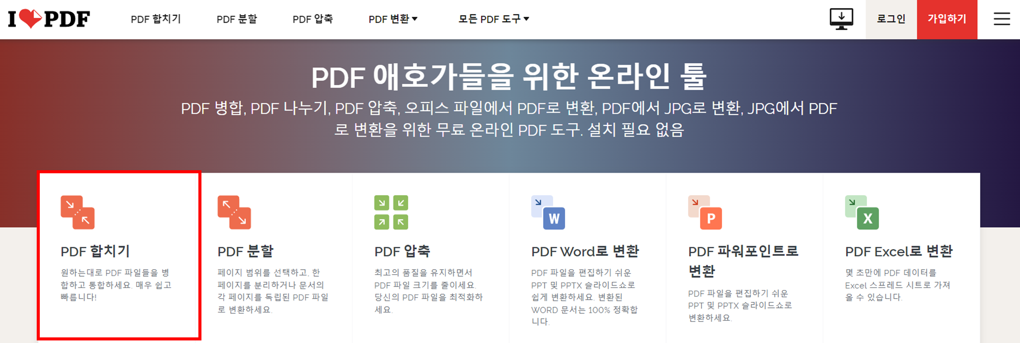 아이러브PDF 사이트에 접속한 모습입니다. PDF 합치기를 눌러주세요. 참고로 로그인 및 가입하기는 하실필요 없습니다.