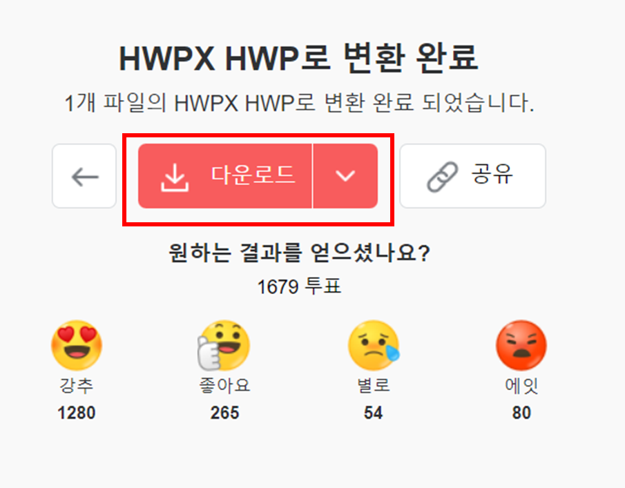 변환이 완료되었으면 다운로드를 눌러 HWP로 변환된 파일을 다운받아 주세요. HWPX 파일의 HWP 파일변환 완료했습니다.