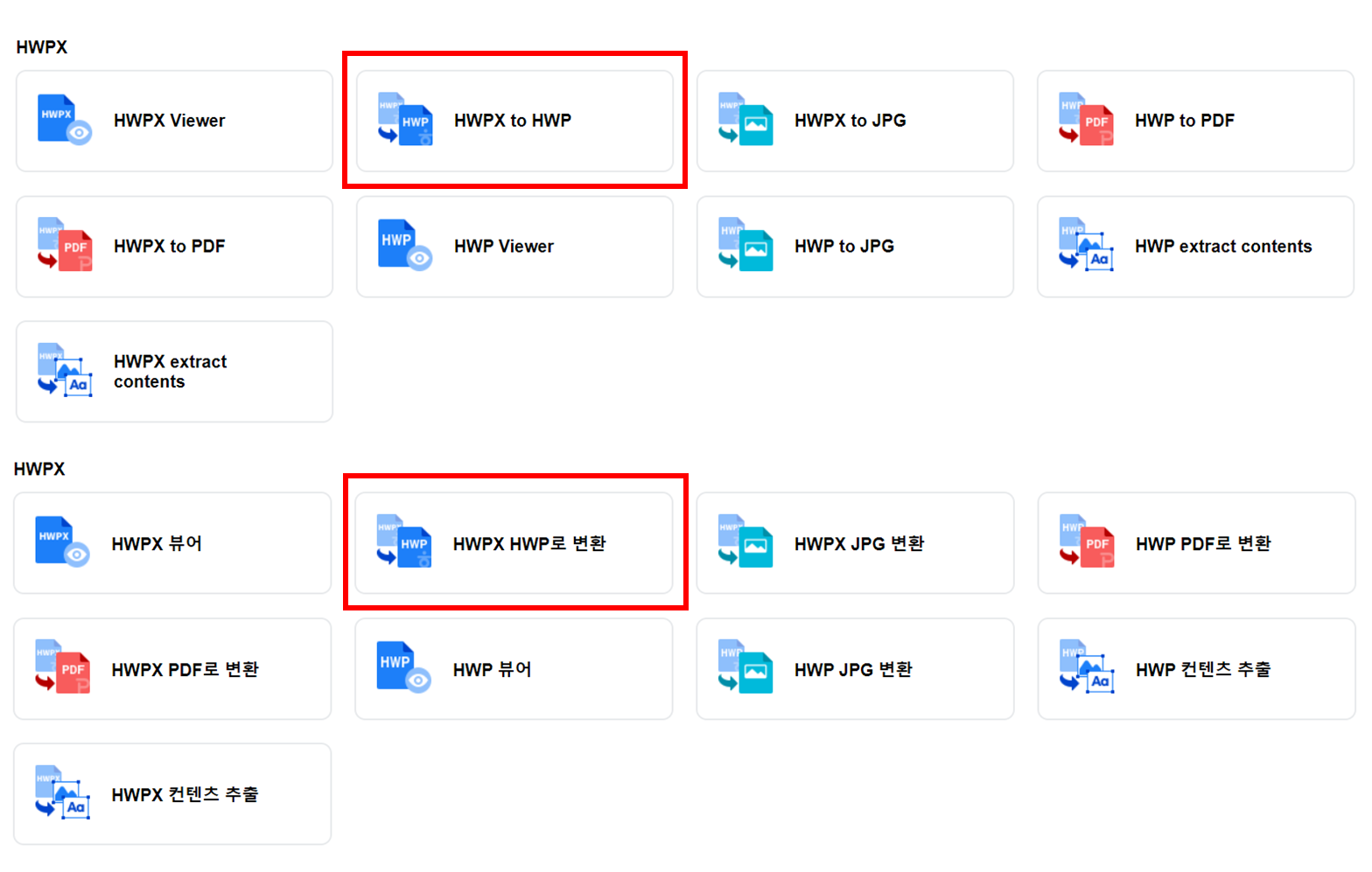 아래로 스크롤을 내리시면 hwpx 관련 항목이 나옵니다. 영어로는 HWPX to HWP, 한글로는 HWPX HWP로 변환을 눌러주세요.
