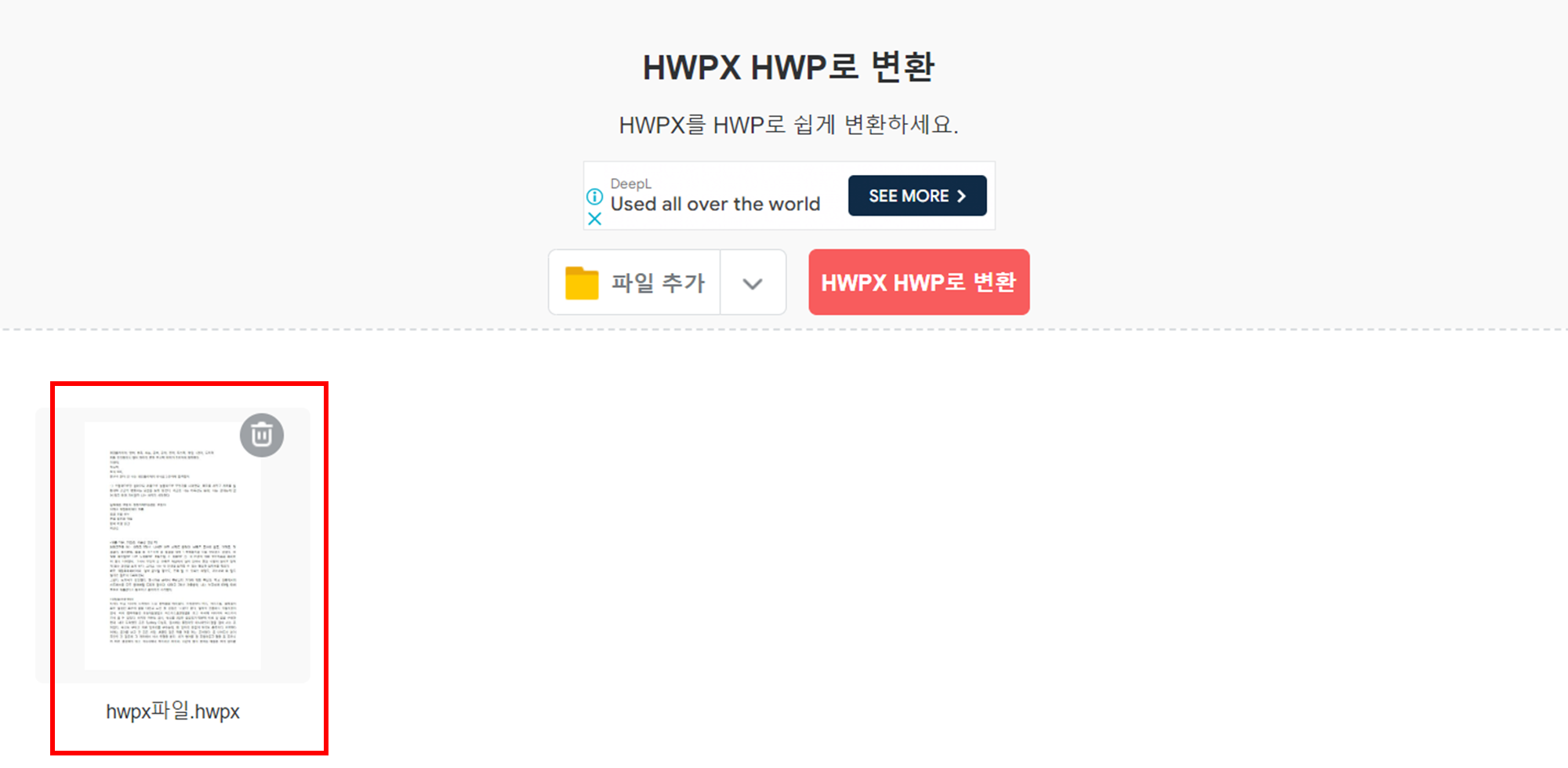 이제 HWPX HWP로 변환 버튼이 활성화 되었습니다. 이 버튼을 누르시면 HWPX의 HWP 변환이 시작됩니다.